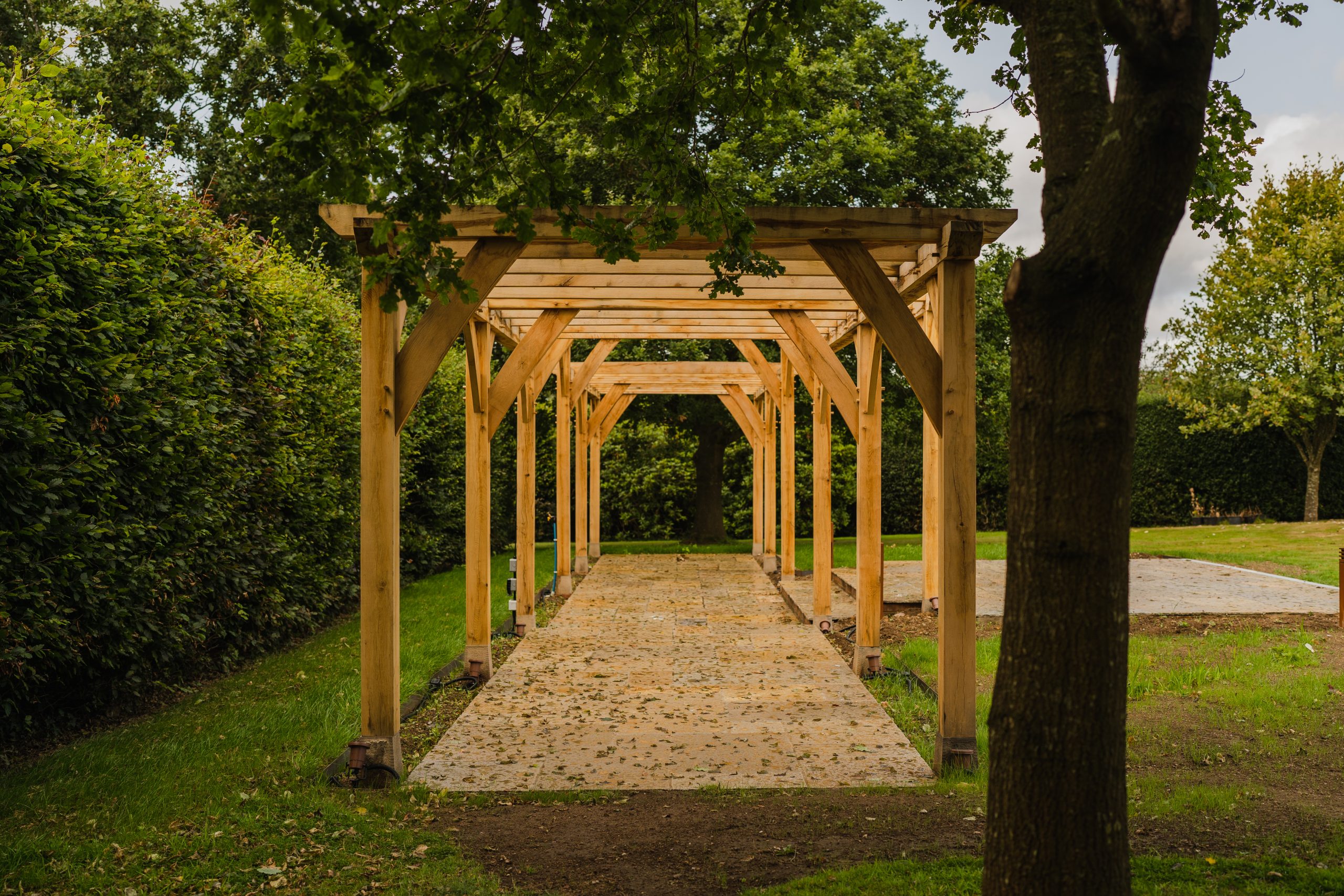 All garden structures are built from structural green oak using mortise and tenon joints for accuracy and strength. Frames are dry-fitted in our Sussex workshop before delivery, so every component aligns correctly on site. Where wider openings or exposed positions require it, additional reinforcement is built into the design.Â