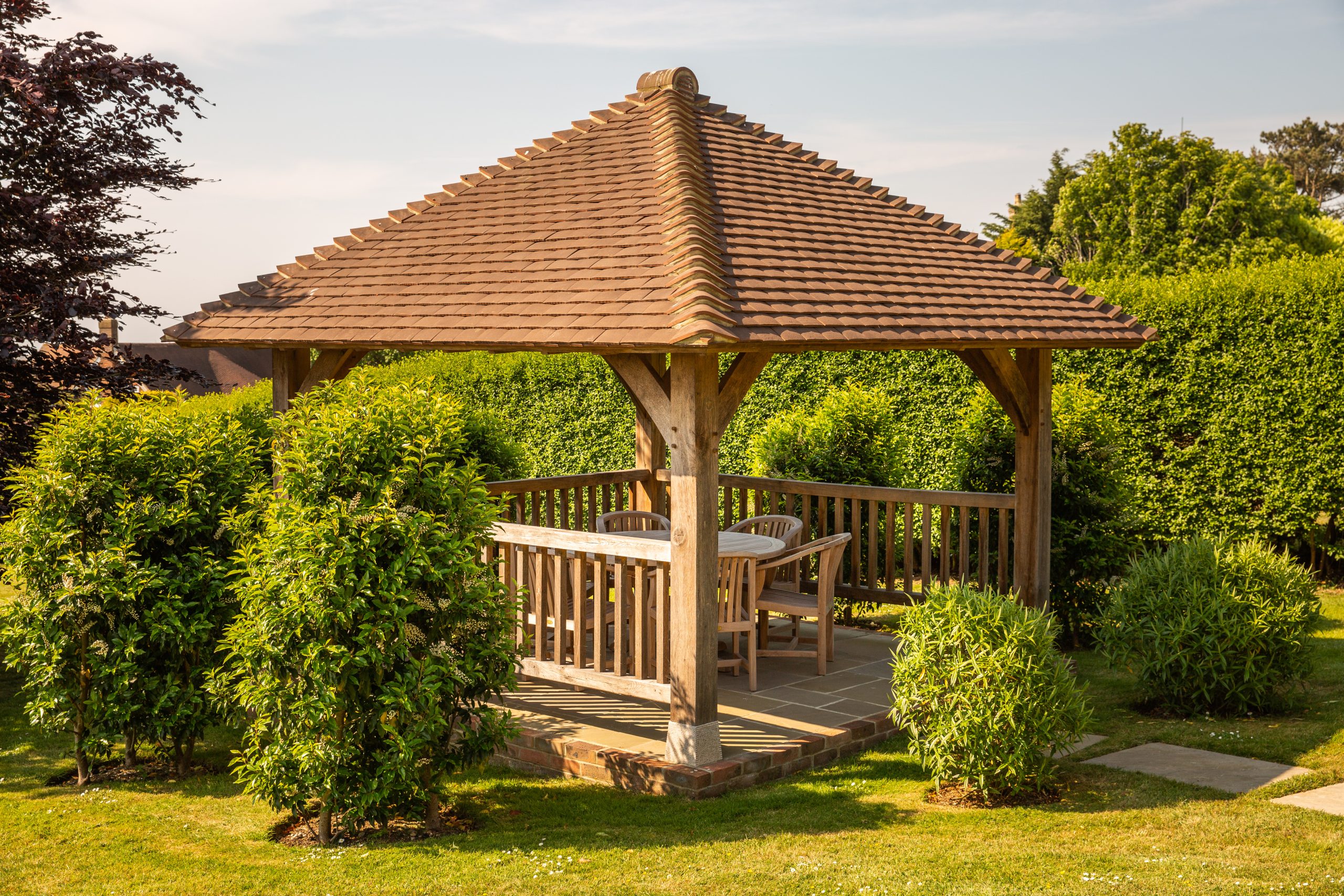 A gazebo has a solid roof and creates a fully sheltered space. A pergola is an open-frame structure, often used for shade, planting or walkway features. Both can be built in structural oak and designed to suit the position and use.