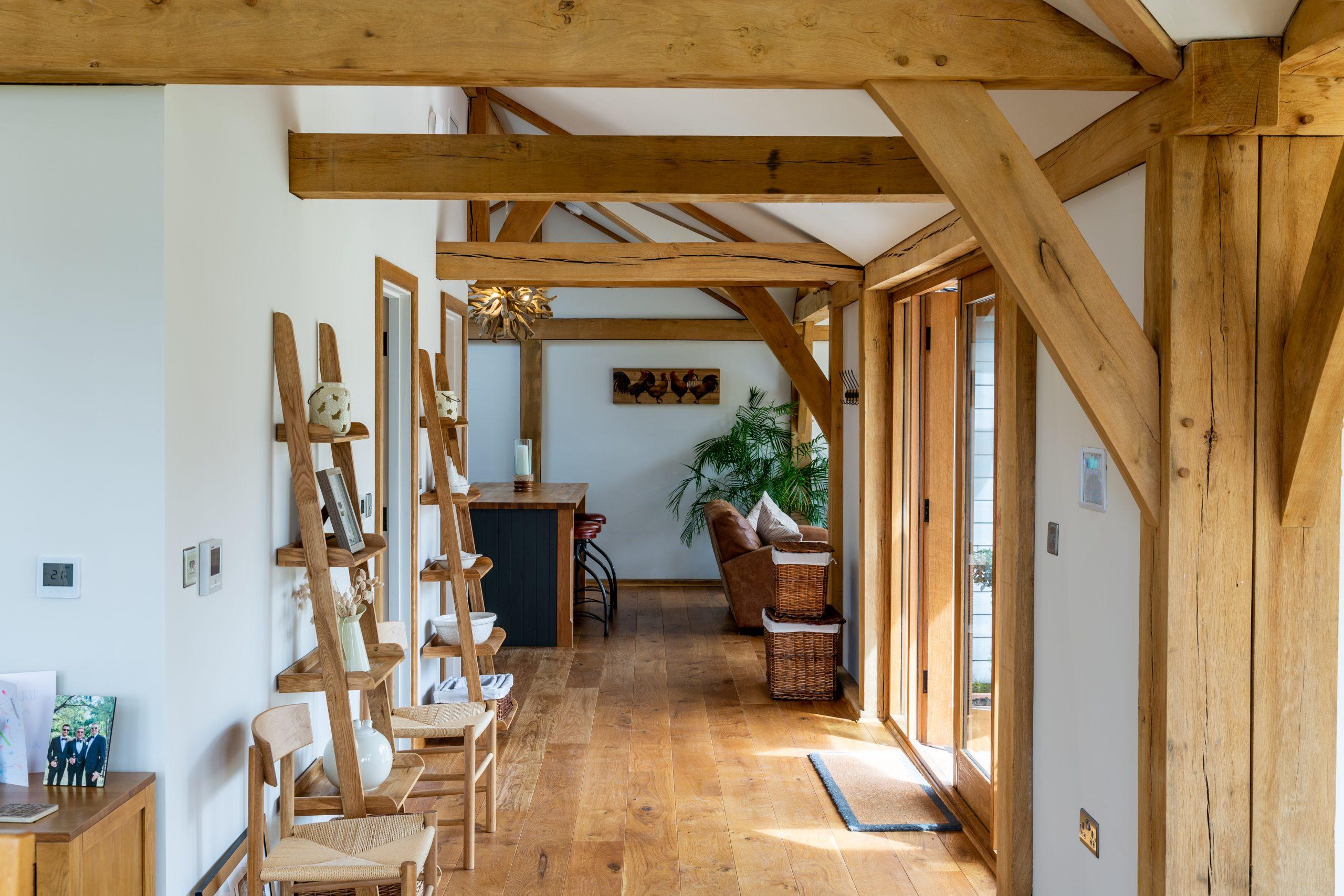 Oak-framed houses offer remarkable architectural flexibility. Vaulted ceilings and exposed trusses create dramatic interior spaces, while oak staircases and structural beams add character throughout the home.
