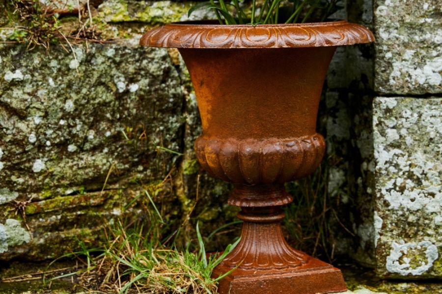 Cast iron urns are exceptionally durable and built to withstand the elements. Over time, they may develop a natural patina or light rusting, which enhances their vintage charm. To maintain their appearance, you can brush off dirt or rust and apply a suitable cast iron treatment if desired. For further care tips or specific questions, our team is happy to assist.